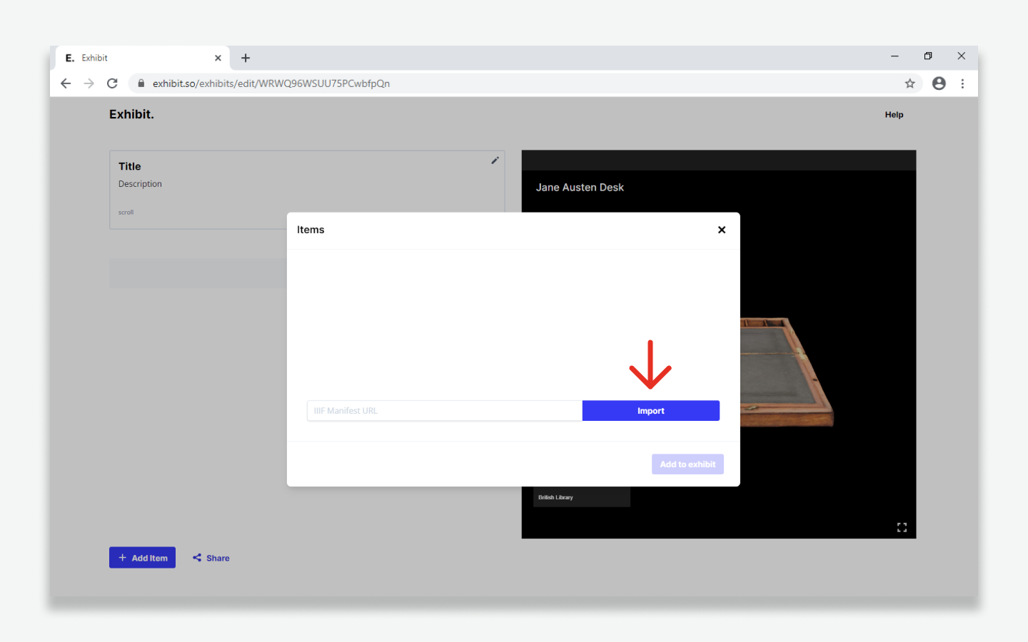 Please note, if you are already using IIIF with your collections and would like a simpler alternative to manually importing items, we recommend you use the Exhibit button. This method is currently adopted at The University of St Andrews and allows users to add items directly from a catalogue to Exhibit.so.