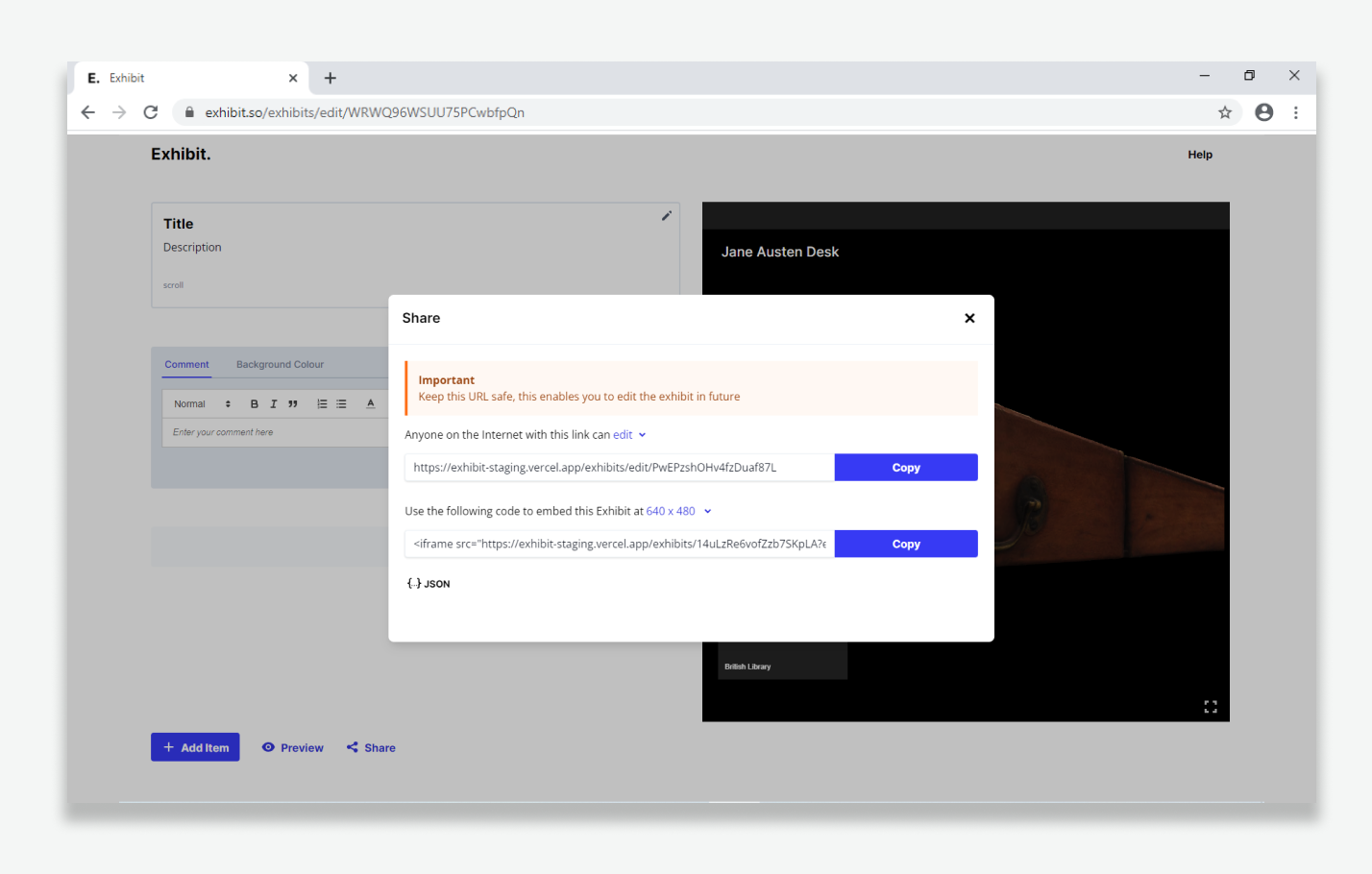 Please note, a different url is generated when selecting either 'edit' or 'view' options. Ensure you save the edit url so you can edit your Exhibit in future. Password protection only works on 'view' urls