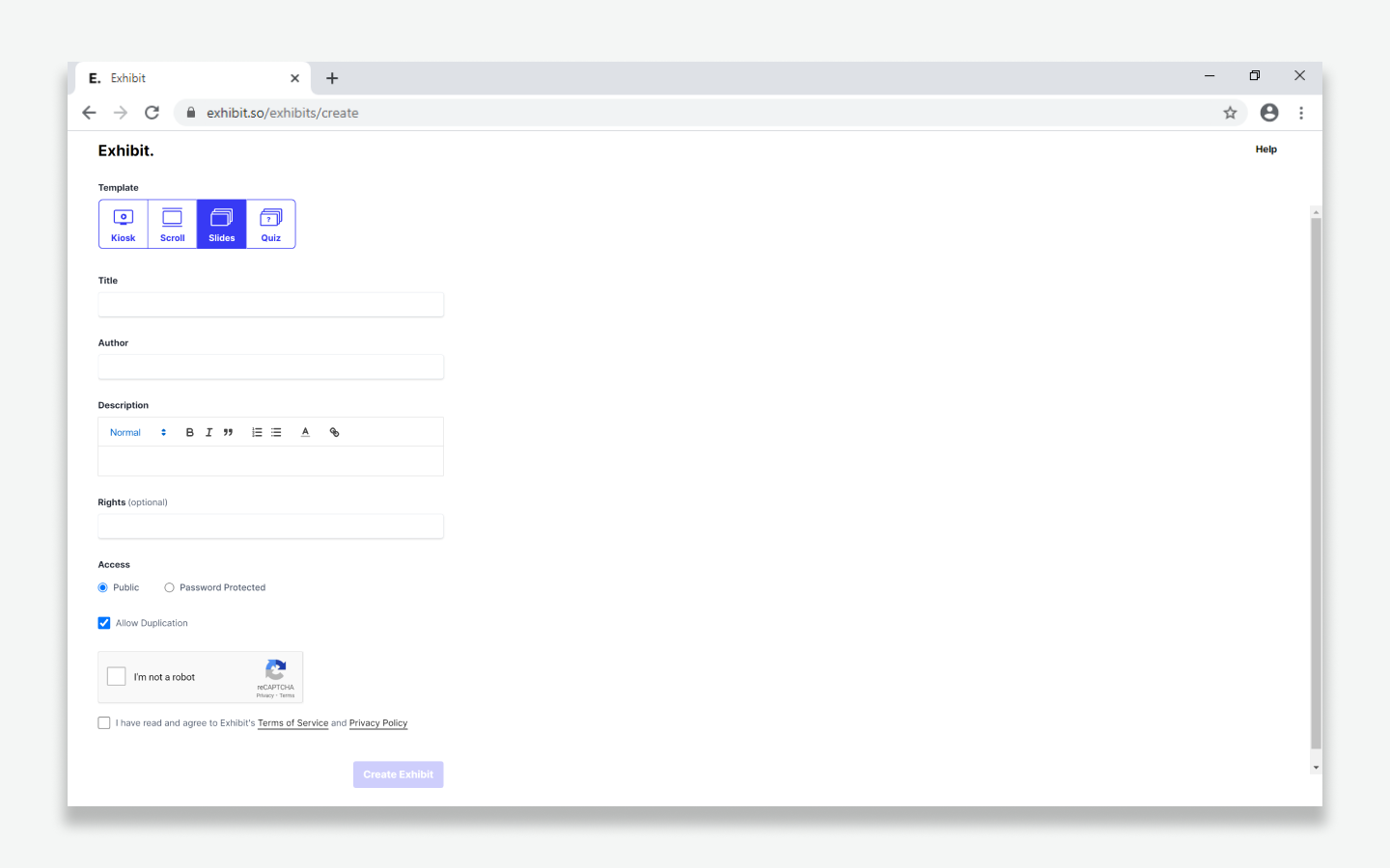 When you create a new exhibit you will be required to complete the following fields. You can amend this information later via the editor.
